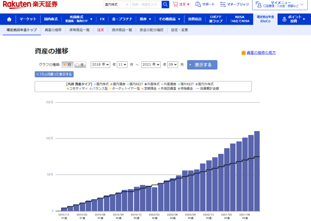 折れ線が積立累計金額で、棒線が時価評価額となっています。